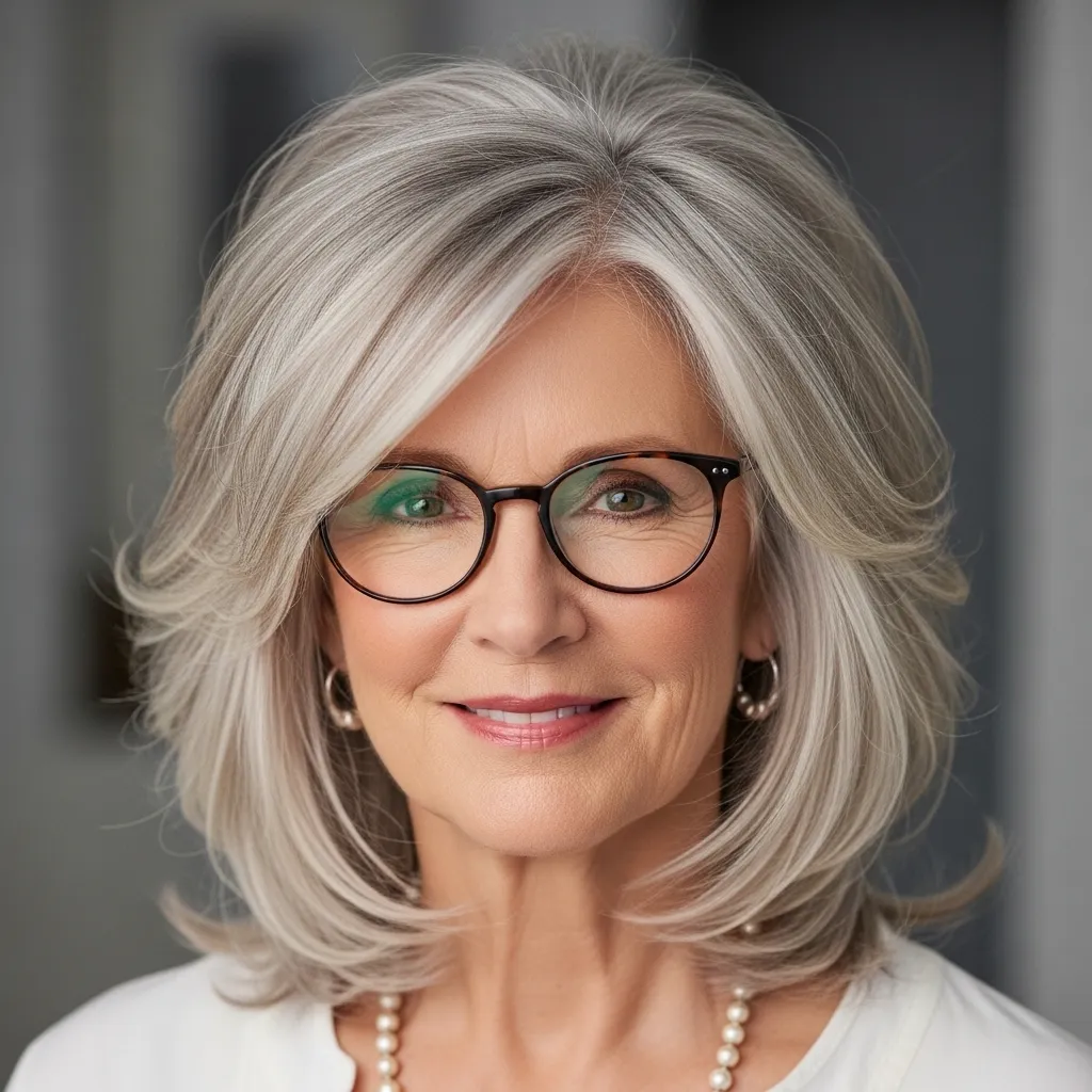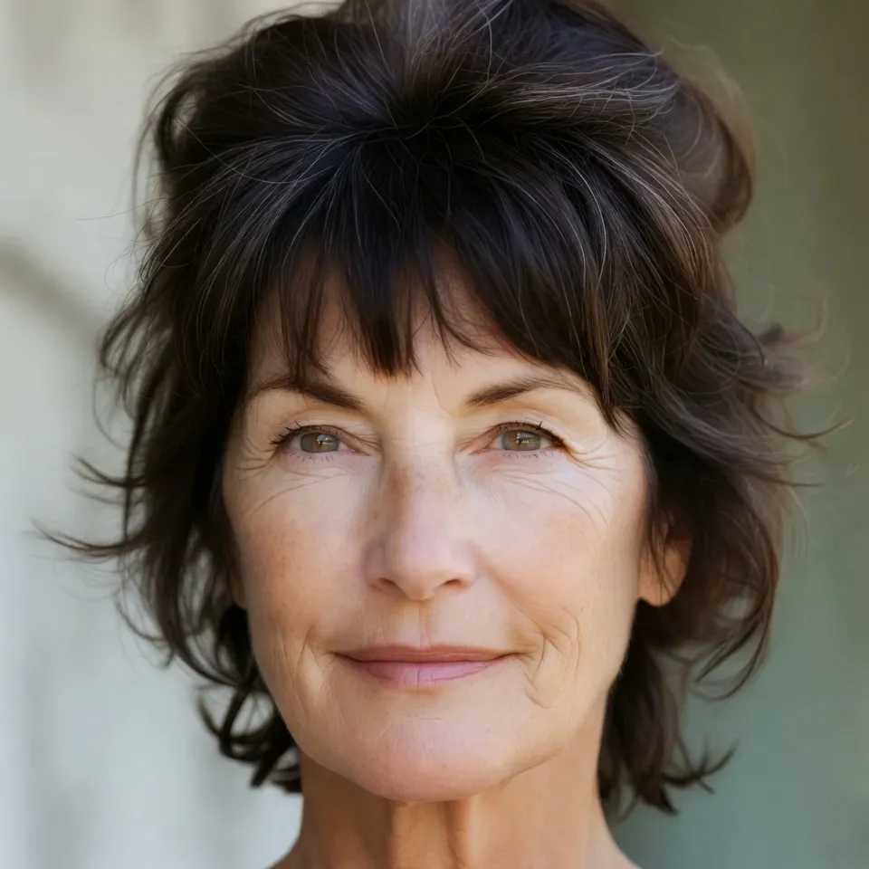 Side-swept bangs paired with a medium shag are incredibly flattering for women over 60. The bangs gently cover the forehead, softening fine lines while drawing attention to the eyes. When blended into shaggy layers, they create a cohesive and youthful frame around the face.