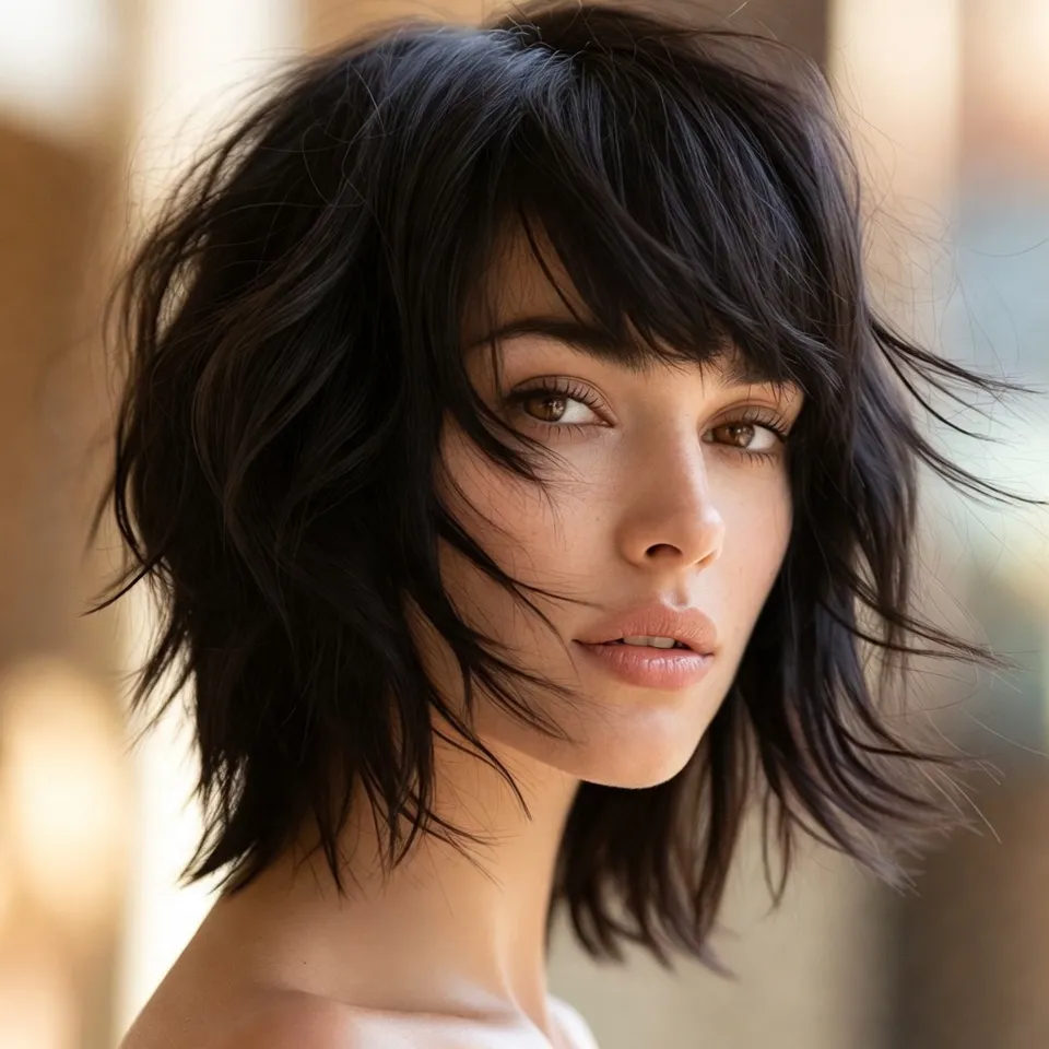 Image Prompt: Medium shag haircut with feathered ends, mature woman, soft movement, airy layers, warm natural lighting.